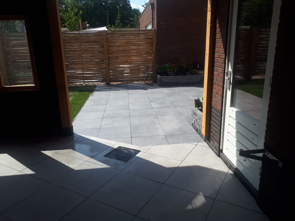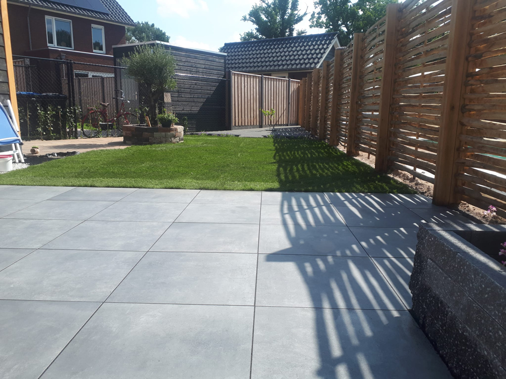 De voor- en achtertuin zijn getransformeerd in levendige en functionele buitenruimtes met een combinatie van grijze tegels, gras en strategisch geplaatste uitsparingen voor planten. Grijze tegels bieden een neutrale basis die harmonieert met verschillende designelementen. De keuze voor grijze tegels geeft een gevoel van samenhang en elegantie aan de hele buitenruimte.